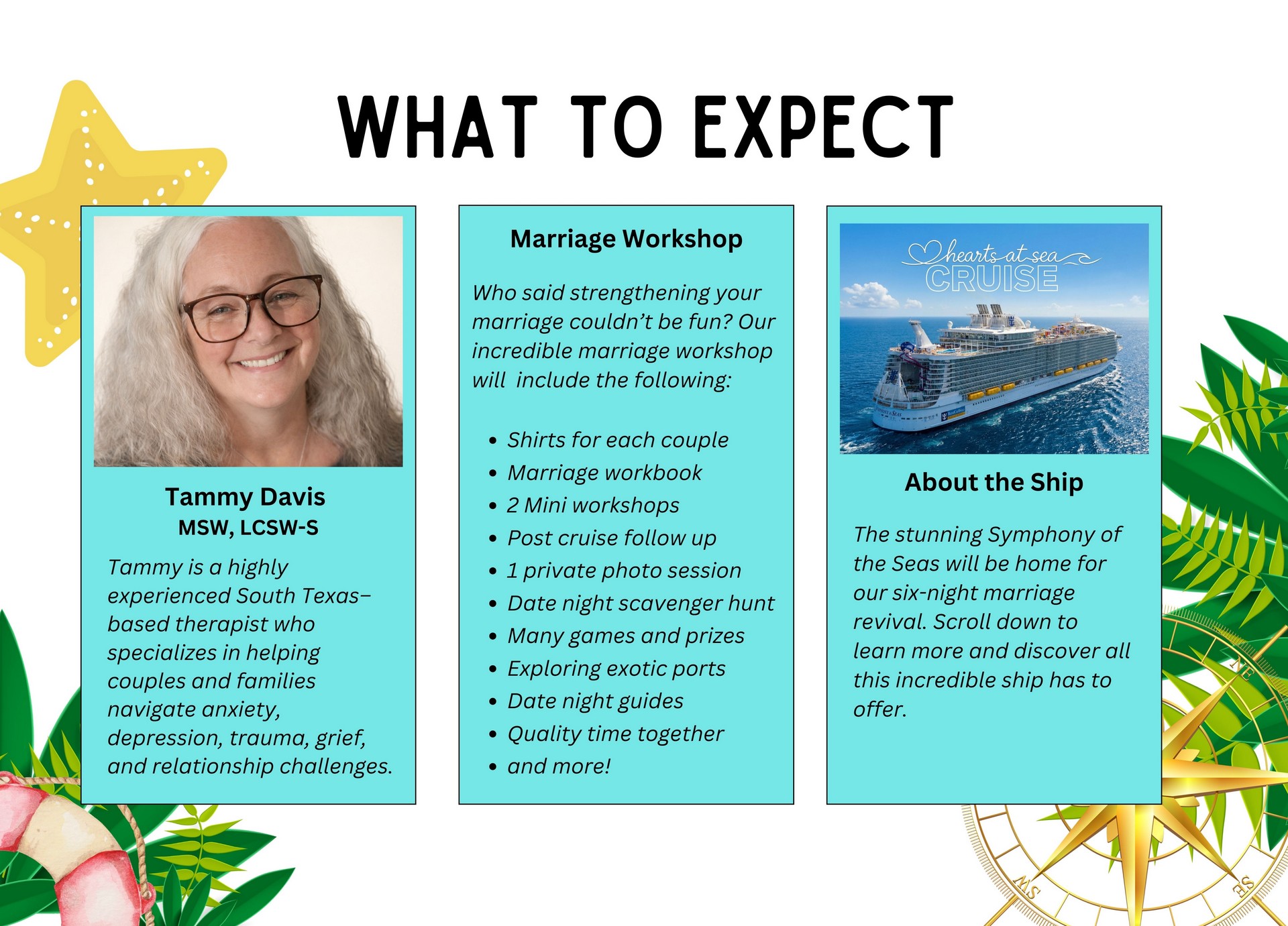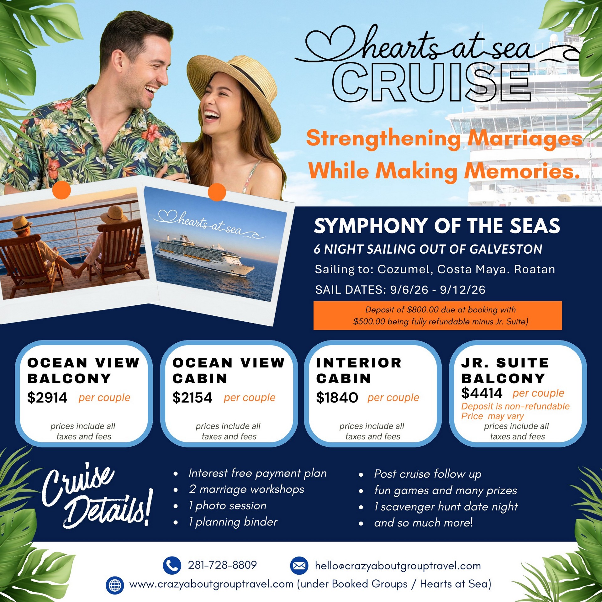Hearts at Sea is more than just a cruise—it’s an unforgettable marriage-strengthening experience designed to help couples reconnect, recharge, and grow together. Set against the beauty of the open ocean, this intentionally curated journey blends meaningful relationship enrichment with relaxation, fun, and romance. Couples enjoy powerful moments of connection, guided discussions, and time to truly focus on one another—away from daily distractions—while still savoring all the excitement and luxury of cruising. It’s the perfect balance of love, learning, and lasting memories.